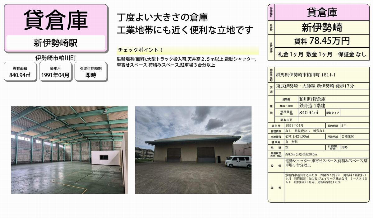 伊勢崎市粕川町1611-1 (新伊勢崎) 粕川町貸倉庫 詳細データ