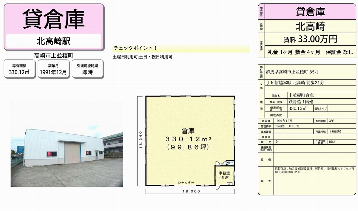 高崎市上並榎町85-1 (北高崎) 北高崎 貸倉庫 詳細データ