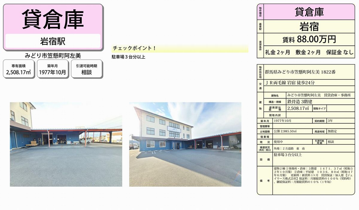 みどり市笠懸町阿左美1822 (岩宿) 岩宿 貸倉庫 詳細データ
