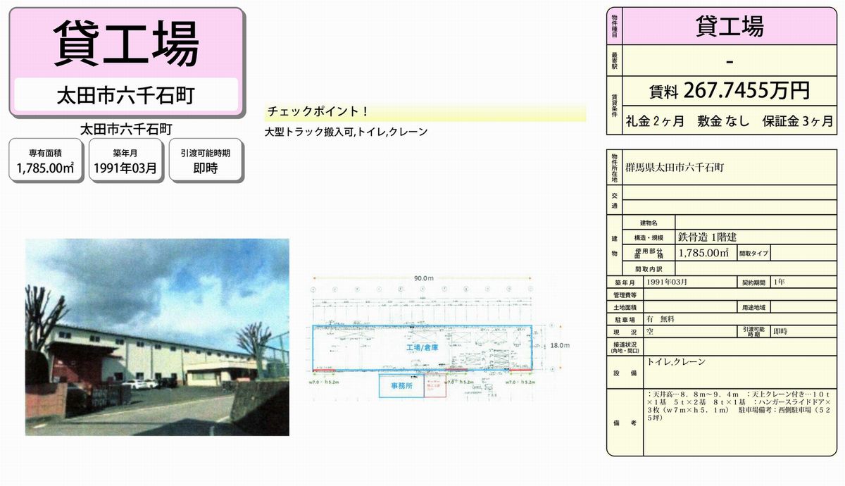 太田市六千石町(群馬県)の貸倉庫・貸工場・貸地をはじめ群馬全域の貸し倉庫・貸し工場・貸し土地を検索できます。太田市六千石町(群馬県)の事務所付貸倉庫、クレーン付工場、店舗倉庫、工業専用地域等、ニーズに合わせて簡単検索。太田市六千石町(群馬県)の貸し倉庫・貸し工場・貸地を貸したい方にはオーナーサポートシステムで無料にて査定・掲載いたします。太田市六千石町(群馬県)で貸倉庫・貸工場・貸し土地をご契約のテナント様には貸し倉庫・貸し工場の設計変更、造作のご相談・施工も承ります。貸倉庫・貸工場・貸地で移転・新規開設をするなら群馬地区最大級のテナント.com!
