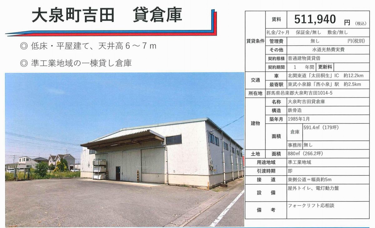 邑楽郡大泉町大字吉田1410 (西小泉) 西小泉 貸倉庫 詳細データ